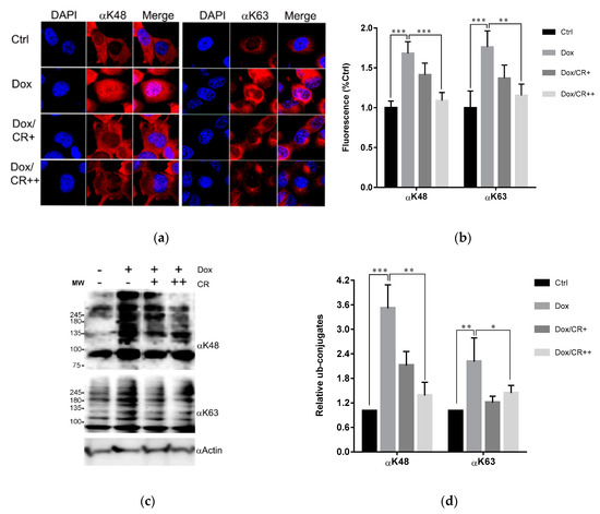 CR inhibits Dox-induced ubiquitination in the cells. (a) Immunofluorescence staining of H1299 cells treated with or without 5 (+) and 10 (++) μM CR for 12 h followed by addition of Dox to a final concentration of 5 μM, with incubation for 12 h. The cells were subjected to immunofluorescence staining using the antibodies against K48 (αK48) and K63 polyubiquitins (αK63). (b) K48 or K63 polyubiquitin level in Figure 6a was quantified by fluorescence signal. At least seven random regions acquired in confocal images were sampled and normalized against DAPI intensity for quantification. (c) Immunoblots of samples in Figure 6a using the indicated antibodies. (d) The band intensity of immunoblots in Figure 6c was quantified and displayed as the relative amount to the control. All error bars represent the standard deviation from at least four independent measurements. Statistical significance was calculated by the Student’s t-test (* p < 0.05, ** p < 0.01, *** p < 0.001).
