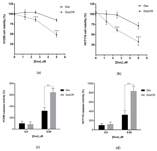CR enhances Dox sensitivity of cancer cells. (a,b) Enhancement of Dox-induced apoptosis of cancer cells by CR treatment. Dox–induced apoptosis of H1299 (a) and HCT116 (b) was quantified by colorimetric cell viability after treating 10 µM CR for 12 h followed by 12h treatment of Dox (0.0–5.0 µM). (c,d) Enhanced caspase activity of Dox-treated H1299 (c) and HCT116 (d) cells by 10 µM CR. Caspase activity was quantified by luminogenic caspase activity assay. Data are displayed as the percentage of control samples (0.0 µM Dox). All error bars represent the standard deviation from at least four independent experiments. Statistical significance was calculated by the Student’s t-test (** p < 0.01, *** p < 0.001).