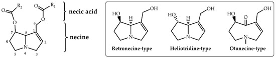 The pyrrolizidine alkaloids (PAs) are widespread plant secondary metabolites. PAs are regarded as natural toxins on account of their potential health risks for both livestock and human [1,2,3]. Amounts of in vivo and in vitro experiments have shown that PAs principally caused damage to the liver [4,5], some might harm the lungs via the blood vessels [6] and even damage the brain [7]. They can also form a series of DNA adducts that cause genotoxicity [8]. It is reported that the toxicity of PAs is mainly related to their chemical structures. The toxic PAs are composed of an 1,2-unsaturated necine base and a necic acid with a branched chain, whereby the carboxylic ester forms a monoester or a diester group, as does the macrocyclic structure (Figure 1A) [9,10]. In general, the chemical structures of toxic PAs are classified into retronecine-, otonecine- and heliotridine-types according to their necine bases (Figure 1B) [11]. As we know, PAs are accumulated primarily in the form of pyrrolizidine alkaloid N-oxides (PANOs) in many plants [12].