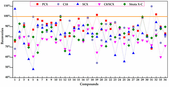 When a blank mixed acid standard solution without a matrix was added to each of the five SPE cartridges, the recoveries of these 34 compounds with Cleanert PCX SPE cartridges ranged from 68.42% to 102.08%. However, the recoveries with Cleanert SCX and C8/SCX fluctuated widely and those of several PAs were only 60% or less. Although the recoveries of C18 and Phenomenex Strata-X-C was relatively stable on the whole, for some individual PAs they were less than 60%, as shown in Figure 3 (detailed recoveries are listed in the Supplementary Materials, Table S1). To sum up, Cleanert PCX SPE, a mixed-mode strong cation exchange sorbent, was found to be the most appropriate clean-up cartridge. It can provide dual ion exchange and reverse-phase retention modes. Furthermore, different ratios of the elution solvent NH4OH/MeOH (3:17→1:3, v/v) were tested to determine the highest elution rate of PAs (details are not displayed). The results showed that the highest elution yield of total PAs was obtained by using a 1:3 (v/v) solution of NH4OH/ MeOH.
