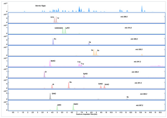 Only two pairs of stereoisomers (intermedine and indicine, intermedine N-oxides and indicine N-oxides) were not separated, but the two unseparated PAs had the same response value as their corresponding isomers. The MRM chromatograms of these isomers are shown in Figure 4. The application of UPLC successfully improved the chromatographic resolution and sensitivity, and dramatically reduced the acquisition time. In the analysis, two organic solvents, methanol and acetonitrile, were compared, it was found that the peak shape and separation effect of methanol was better. By optimization, methanol and water with 0.05% formic acid and 2.5 mM/L ammonium formate were selected as acidic mobile phases.