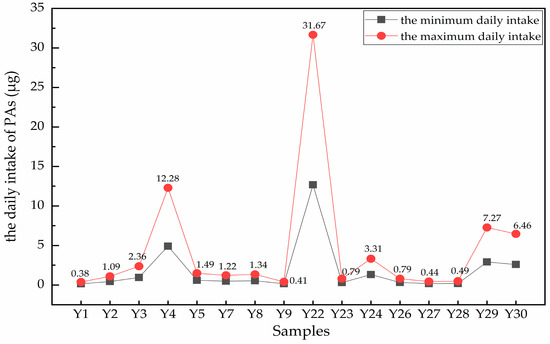 The maximum and the minimum daily intakes of A. capillaris. Only the 16 samples that displayed maximum daily intakes exceeding the baseline value (0.35 μg/day for a 50 kg person) are shown and their calculated values are marked on the chart.