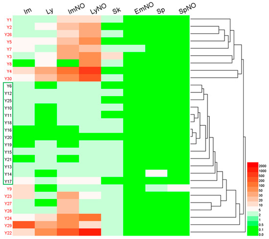 HCA, a multivariate analysis technique, is commonly used to classify samples into groups by generating dendrograms [48]. A hierarchical clustering heatmap was used in this study to visualize the relations between different sample sources and PA concentrations (Figure 8). As shown in the HCA heatmap, the A. capillaris samples were roughly classified into two main groups (I and II). Group I (in red font) consisted of samples with total PA contents exceeding the baseline, which included 16 samples (Y1–Y5, Y7–Y9, Y22–Y24 and Y26–Y30). Group II (in black font and in the green box) was composed of samples with PA levels not exceeding the baseline. This result was in accordance with that of the daily intake given in Figure 7.
