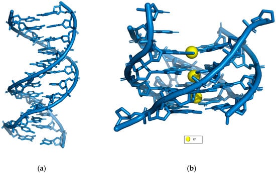 Comparison of (a) DNA double helix (PDB: 1BNA) and (b) DNA G-quadruplex stabilized by K+ (PDB: 244D).