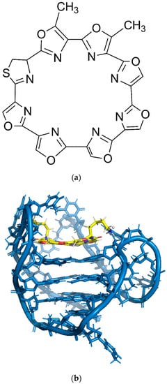 (a) Chemical structure of telomestatin. (b) Solution structure of an intramolecular (3 + 1) human telomeric G-quadruplex bound to a telomestatin derivative (PDB: 2MB3).