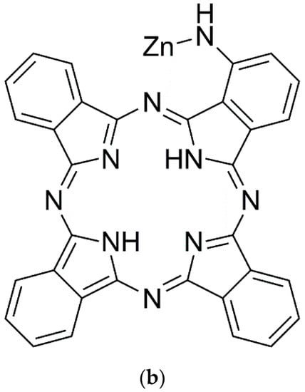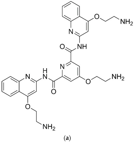 Pyridostatin (see Figure 8a) is a small molecule that is known to particularly stabilize G4 DNA complexes, triggers neurotoxicity and induce DNA double-strand breaks (DSBs) in cultured neurons []. Also, zinc aminophthalocyanine (ZnAPC) (see Figure 8b) has been demonstrated to bind to a G4-forming oligonucleotide derived from 5′-untranslated region of NRAS mRNA, causing a selective cleavage of the target RNA G4 upon photo-irradiation [].