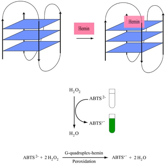 Horseradish peroxidase (HRP) can be used in an enzyme-conjugated assay as a label mainly to detect proteins in immunoassays and can also be adopted for DNA detection too. As modifications can be expensive and cumbersome, the availability of a peroxidase-mimicking DNAzyme formed by the binding of a G4 with hemin is an interesting alternative [,,]. The peroxidase mimicking catalytic activity of G4 DNAzyme catalyzes the oxidation of 2,2′-azinobis(3-ethylbenzothiazoline-6-sulfonic acid) (ABTS2−) to produce a colorimetric change from a colorless solution to a visible blue-green product (see Figure 9). DNAzyme systems involving other substrates like luminol, 3,3′,5,5′-tetramethylbenzidine sulfate (TMB), 4-chloro-1-naphthol (4-CN) or scopoletin (Sc), in the presence of hydrogen peroxide (H2O2) can also be used to produce colorimetric, electrochemical and fluorescence readouts [,,,,,]. However, colorimetric G4-hemin DNAzyme-based biosensors are utilized in diagnostics for its simplicity, fast analysis, low cost and most notably, the ability to detect target molecules visually. The ABTS2− substrate supplemented with H2O2 DNAzyme can be designed to generate the colorimetric change as the outcome of the detection of a particular target.