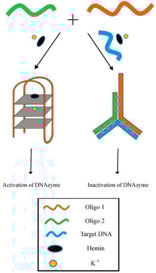 Single nucleotide polymorphisms (SNPs) is a condition that may lead to the development of numerous human diseases which includes complications such as Alzheimer’s, sickle cell anemia, cystic fibrosis and certain cancers []. A series of sensors utilizing protein enzymes have been established for the detection of SNPs. Restriction enzymes can also be employed to detect SNPs, but are limited to the recognition sequence of the enzyme recognition domain. Ligase was also reported to be capable of detecting SNPs in random DNA sequences [,], but this type of assay is relatively expensive and vulnerable to the surrounding conditions []. In view of the limitations of existing methods, a turn-off colorimetric sensor was developed utilizing the aforementioned DNAzyme system for the recognition of SNPs based on G4-hemin DNAzyme and Y-shaped DNA duplex. In this assay (see Figure 10), Oligo 1 (G-rich sequence) and Oligo 2 were designed to be partially complementary to each other. Oligo 1, Oligo 2 and target DNA will hybridize with each other to form a Y-shaped DNA duplex (3-way junction) in the presence of target DNA. This will render the DNAzyme sequence unavailable for catalytic reaction, thus inactivating the DNAzyme. Therefore the resulting outcome is a decrease of the absorbance readout of the oxidation product of ABTS2− [].