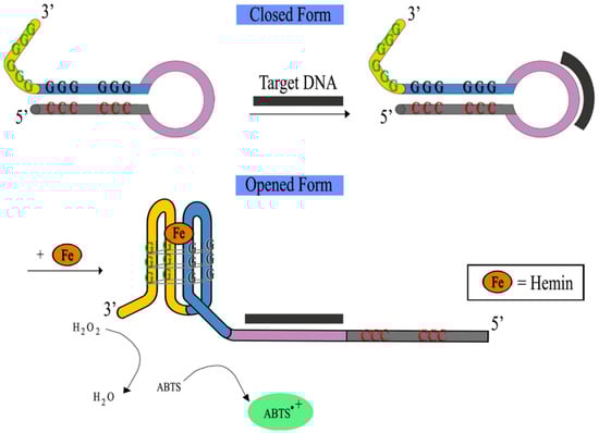 The split G4 design can also be applied to the molecular beacon (MB) concept devoid of the fluorophore-quencher complex whilst maintaining their specific catalytic activity. MB was first reported in 1996 and has since been one of the most widely used systems for DNA biosensors [,]. Originally, the MB system alone relies on the concept of a closed to opened conformational change in the presence of a target DNA. The conformational change can be detected with simultaneous production of a fluorescence signal. MBs are basically hairpin-shaped oligonucleotides that contain a stem-loop structure []. The DNA bases on both sides of the stems are connected by hydrogen bonds whereas the 5′- and 3′-end of the MBs are respectively labeled with a fluorophore and a quencher []. The construct will then unfold in the presence of the target sequence to hybridize, resulting in the separation of the fluorophore from the quencher to yield a fluorescent output. However, besides being costly it is known that the utilization of the fluorophore and quencher also requires complicated modification and complex operation making it cumbersome []. In this alternate rendition of MB, G4 MB-based detection of nucleic acids involves no fluorophore-quencher complex but incorporates the guanines needed for the formation of the G4 into the stem formation of the MB (see Figure 11). Subsequent binding to the target will open the MB stem permitting the guanines to be made available to engage in G4 formation.