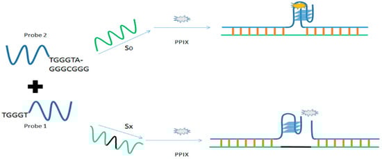 In a study conducted to measure the length of DNA based on the base number between two selected sequences, PPIX was chosen as a probe to study the split G4 formation (see Figure 13). Therein, two G-rich strands were hybridized to the target strand, driving the G-rich strands together in the middle of the complex molecule. PPIX in solution bound to the G4 and its fluorescence intensity decreased dramatically in the presence of additional bases in the middle of the target strand. The addition of extra bases in the middle of the target strand results in an unstable structure of split G4 due to the increase distance between them. This in turn decreases the affinity of the split G4 for PPIX resulting in a decreased fluorescence intensity [].