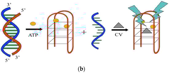 Since the conjugation of aptamers may lead to other unwanted issues and considering the unique feature of aptamers to adopt G4 structures upon binding to their cognate ligand, attempts have been made to develop a detection strategy devoid of aptamer modifications or without the use of enzymes. Various studies have been conducted utilizing non-covalent fluorescence on aptamer-based detection system. In one of these studies, a switch-on method for the detection of adenosine triphosphate (ATP) using aptamer based on a duplex-to-quadruplex conversion strategy was reported. Abnormal ATP levels from an overproduction of ATP by creatinine kinase has been associated with diseases like angiocardiopathy, making accurate detection of ATP a critical assessment for angiocardiopathy []. The ATP detection method applied a label-free fluorescence switch-on assay, utilizing crystal violet (CV) (see Figure 17a) to monitor the conversion of the ATP aptamer in the presence of ATP (see Figure 17b). It was also suggested that such a G4-based design could reduce the non-specific binding of the probe, while maintaining the simplicity and cost efficiency of label-free detection. In this system, the ATP aptamer and its complementary sequence were initially hybridized. In the absence of ATP, the binding of CV to the duplex DNA was weak resulting in a low emission of fluorescence signal. The duplex conformation was claimed to be in equilibrium with a small population of dissociated single strands allowing the ATP aptamer to form a G4 structure. Through population-shift mechanism, the presence of ATP will trigger the dissociation of the duplex and the formation of the aptamer-target complex as ATP only stabilizes the G4 structure of the aptamer. A strong interaction between the CV and the G4 was formed, producing a significant fluorescence response to ATP [].