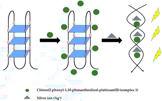Silver ions develop cytotoxicity in humans [] and are associated to a number of medical complications including organ failure []. This highlights the importance of silver ion level determination in the body. To carry out silver (I) ion detection in aqueous solution, a luminescence-based G4 sensing system was developed utilizing chloro(2-phenyl-1,10-phenanthroline)-platinum(II) (complex 1). As Ag+ ions are able to destabilize the G4 structure [], G4 structures can undergo conformational change from G4 to a duplex structure. The formed duplex structure allows the intercalation of complex 1, producing a high emission intensity (see Figure 19). However, low emission intensity is observed in the absence of Ag+ owing to the weak interaction of complex 1 with G4. Upon addition of various metal ions other than silver, the emission intensity only increases slightly suggesting the selectivity of the system for Ag+ ions [].