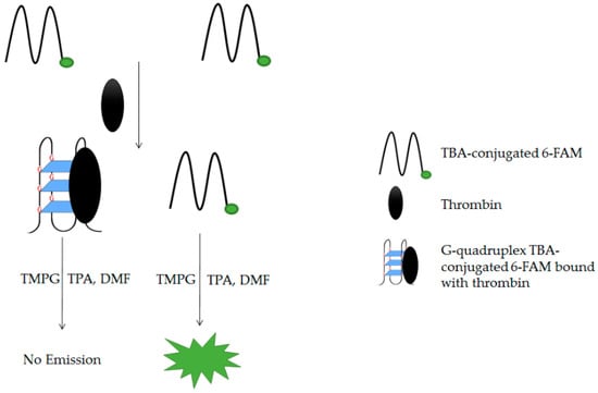 It is also assumed that in the absence of other possible interactions in RNA due to its free 2′-OH groups, the high stability of G4s are often required for DNA aptamers to adopt more complex non-canonical structures for ligand binding. Upon ligand binding, a nucleic acid aptamer converts from a non-quad or unstructured conformation into a G4 motif. This can then be effectively monitored through transduction into various outputs such as fluorescence and luminescence in a number of ways []. Aptamers are interesting alternative binders in sensory applications due to their simplicity, reusability and stability under a variety of environmental conditions. They are also cheaper to be synthesized and modified []. Aptamers also offer other advantages such as a lower molecular weight, reproducible synthesis, controllable labeling, flexible design, low immunogenicity and fast tissue penetration [].