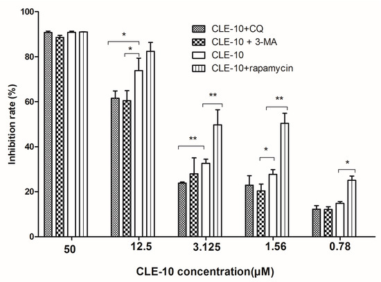 To corroborate the impact of autophagy on CLE-10-induced MDA-MB-231 cell death, CLE-10 was used, pretreated with an autophagy inhibitor (chloroquine (CQ), 3-methyladenine (3-MA)) and a mTOR agonist (rapamycin). The concentration of inhibitors was at a safe level with no cytotoxicity against MDA-MB-231 cells. Autophagy inhibitors 3-MA or CQ weakened the inhibition of CLE-10 on the growth of MDA-MB-231 cells with the IC50 levels of 6.91 µM and 6.49 µM, respectively (Figure 3). There was no distinct difference on the inhibitory effect between the CLE-10 + 3-MA group and the CLE-10 + CQ group. Furthermore, rapamycin significantly enhanced the inhibitory effect of CLE-10, especially at a low CLE-10 concentration with the IC50 of 2.38 µM, indicating that CLE-10 induced autophagy, leading to breast cancer cell death rather than a protective mechanism.
