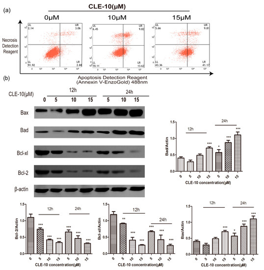 The rates of apoptotis (accumulating both in Annexin V-Enzo Gold-positive/Necrosis Detection Reagent-negative (early apoptosis) and Annexin V-Enzo Gold-positive/Necrosis Detection Reagent-positive (late apoptosis)) were 5.94%, 23.44%, and 50.98% (Figure 4a,b) after treating with CLE-10 (0, 10, and 15 µM) for 24 h. These data indicated that CLE-10 exerted obvious apoptosis in a dose-dependent manner. In addition, Western blot revealed that CLE-10 downregulated Bcl-2 and Bcl-xl expressions and upregulated the expression of Bax and Bad (Figure 4b).