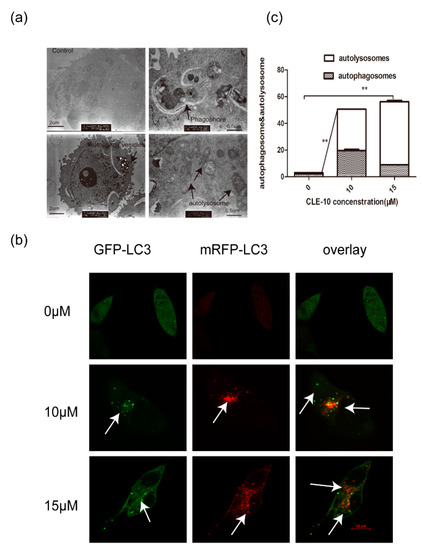 To confirm whether CLE-10 induced autophagy in MDA-MB-231 cells, TEM observation and the formation of mRFP-GFP-LC3 puncta were employed. Transmission electron microscopy indicated an enhanced presence of autophagosomes, autophagic vesicles, and autolysosomes in cells treated with 15 µM CLE-10 for 24 h (Figure 5a). Condensed cytoplasm, membrane invagination, and the disappearance of microvilli were observed at the same time. To further research the autophagy flux induced by CLE-10, MDA-MB-231 cells were transfected with mRFP-GFP-LC3 adenovirus before treatment with CLE-10. Autophagic flux was analyzed by the evaluation of mRFP-LC3 and GFP-LC3 puncta locations. GFP fluorescence (green dots), quenched easily in autolysosomes, is visible only in autophagosomes. Meanwhile, mRFP (red dots) signals can be observed under the environment of autophagosomes and autolysosomes. When the two colors merged together, yellow dots representing autophagosomes and red dots representing autolysosomes can be observed. As illustrated in Figure 5b,c, obvious enhancement in the amount of yellow puncta (autophagosomes) and red-only puncta (autolysosomes) appeared and the number of red dots was greater than the number of yellow dots, indicating that CLE-10 accelerated autophagic flux without suppressing the function of lysosomes or the fusion of autophagosomes and lysosomes. Therefore CLE-10 served as an autophagy inducer.