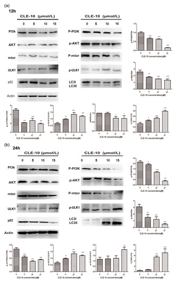 Influence of CLE-10 on the expression of the PI3K/Akt/mTOR signal pathway and autophagy-related proteins. (a) After 12 h of treatment with CLE-10, PI3K, Akt, mTOR, p-PI3K, p-Akt, p-mTOR, ULK1, p-ULK1, p62, LC3-I, and LC3-II expressions in MDA-MB-231 cells were analyzed by Western blot. (b) After 24 h of treatment of CLE-10, PI3K, Akt, mTOR, p-PI3K, p-Akt, p-mTOR, ULK1, p-ULK1, p62, LC3-I, amd LC3-II expressions in MDA-MB-231 cells were detected by Western blot. Data are expressed as the mean ± SD (n = 3). (* p < 0.05, ** p < 0.01, *** p < 0.001 compared with the 0 µM CLE-10 group).