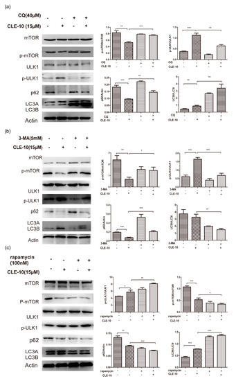 Effect of CLE-10 on autophagy-related proteins LC3-I/II, p-ULK1, ULk1, p62, mTOR, and p-mTOR were detected with and without autophagy inhibitor 3-MA, CQ, as well as the mTOR agonist rapamycin by Western blot analysis. (a) CLE-10 was used in combination with CQ. (b) CLE-10 was used in combination with 3-MA. (c) CLE-10 was used in combination with rapamycin. (* p < 0.05, ** p < 0.01, *** p < 0.001 compared with the control group or the CLE-10 group).