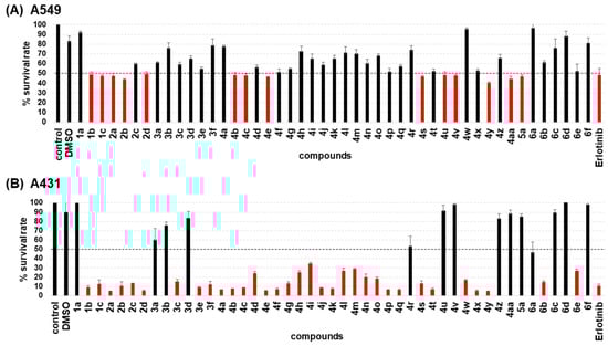 Relative survival rate (%) of the (A) A549 and (B) A431 cells after treatment with 100 µM of the indicated chalcone derivative or erlotinib for 72 h. Data are shown as the mean ± one standard deviation, derived from three independent repeats of triplicate cultures. Means in red bars are ≤ 50% survival (below the black dashed line) and those with a different letter are significantly different (p < 0.05).