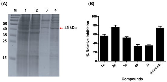 (A) Representative sodium dodecyl sulfate-polyacrylamide gel electrophoresis (SDS-PAGE) gel analysis of the enrichment of the rEGFR-TK intracellular domain (ICD), loading 5 µg protein per track. Lane M: molecular weight marker of standard protein; Lane 1: supernatant, Lane 2: Flow through, Lane 3: 10% of buffer B, Lane 4: 45 kDa of EGFR-TK domain (B) The relative rEGFR-TKI activity (%) of the five potent chalcone derivatives and erlotinib at 1 μM, as assayed using the ADP-glo kinase assay. Data are shown as the mean ± one standard deviation, derived from three independent repeats. Means with a different letter are significantly different (p < 0.05).