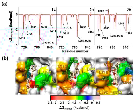 (A) Per-residue decomposition free energy of the three chalcone/EGFR-TK complexes and (B) their binding orientation inside the ATP-binding pocket of the TK domain drawn from the last MD snapshot, where the energy contour of residue contribution for ligand binding is shaded.