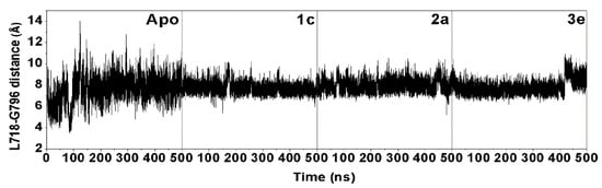 To identify the structural change in the ATP binding pocket affected by complexation with chalcones, the distance between the centers of mass of the two hydrophobic residues (L718 and G796; Figure 4B) was calculated during the MD simulation time. The distance plot (Figure 6) showed that in comparison to the apo system (~4.0 to ~14.0 Å) the three complexes had a shorter distance (~7.0 to ~9.0 Å), which was maintained at a lower fluctuation level, indicating an induced-fitted mechanism for chalcone binding to EGFR-TK. This result was well supported by the lower water accessibility into the ATP binding site (Figure 7) in all three complexes (1c: ~400–1200 Å2; 2a: ~800–1500 Å2; and 3e ~700–1500 Å2) relative to that for the apo form (~1300–2000 Å2). Note that increase in L718-G796 distance in the system 3e after 400 ns had affected to ligand binding pocket only as seen by increased RMSD of the binding residues by 0.5 Å without overall structure change (Supplemental Figure S3).