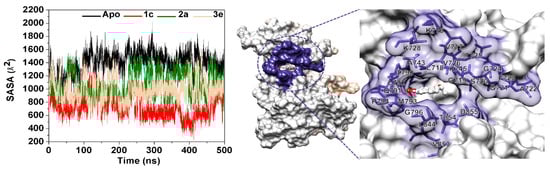Solvent-accessible surface area (SASA, Å2) of the apo form and three chalcone complexes along the 500-ns MD where the amino acids within a 7-Å sphere of chalcone used for the SASA calculations are also shown on the right-hand side.