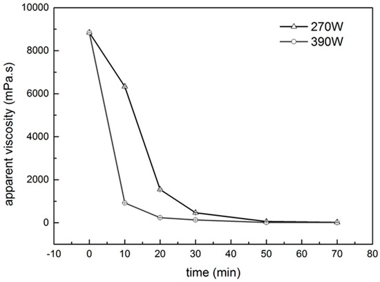 The apparent viscosities of the PGA-XG complexes under ultrasonic treatment at different intensities are shown in Figure 1 as a function of time. For both intensities, the apparent viscosity of the polysaccharide solution decreased with time. At higher power (390 W), the apparent viscosity decreased steeply from the initial value to a minimal level (similar to that of water) within 20 min of exposure to ultrasound. At lower power (270 W), the apparent viscosity decreased to a minimal level (similar to that of water) within 30 min of ultrasound treatment. At the beginning of treatment (after 10 min) at 390 W, the apparent viscosity decreased rapidly from 8700 mPa/s to 300 mPa/s. As the treatment time increased from 30 to 70 min, a decrease in the rate of the smaller change in apparent viscosity was observed and reached an optimum value (15 mPa/s) after 70 min. In comparison, the reduction of apparent viscosity was higher and considerably faster at high ultrasonic intensity. A stronger reduction in apparent viscosity was obtained using a higher intensity, implying that ultrasonic intensity has a significant influence on the ultrasonic degradation of polysaccharides. This degradation may be due to cavitation action (mechanical effect), which increases with higher ultrasonic intensity. Subsequently, this decreased the threshold of cavitation and increased the number of cavitation bubbles [15].