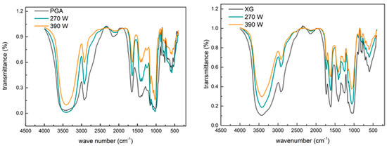 Fourier transform infrared (FTIR) spectra of native and 270 W and 390 W ultrasonically treated propylene glycol alginate (PGA) and xanthan gum (XG).