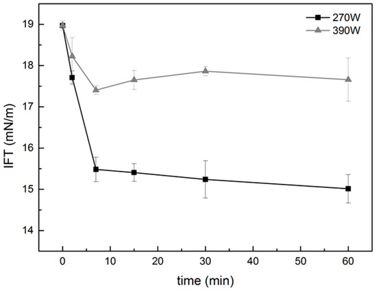 The interfacial characteristics of surface-active ingredients are a significant factor in determining their ability to form and stabilize emulsions [16]. This study examined the interfacial tension between polysaccharide solutions and coconut oil (Figure 5). The experimental results indicated that ultrasonic power reduces the interfacial tension at the oil-water interface, thus indicating that ultrasonic treatment can change the adsorption characteristics of the PGA-XG complexes at this interface (Figure 5). However, different ultrasonic intensities and treatment times showed variations in their ability to decrease interfacial tension at the O/W interface. We found that PGA-XG complexes significantly reduced the interfacial tension compared to water (23.5 mN/m) at coconut oil–polysaccharide solution interfaces. The presence of both hydrophilic and hydrophobic bonds enabled the effective adsorption of the PGA-XG mixture at the interface of the coconut oil. According to Figure 5, during the early stages of ultrasonic treatment, the interfacial tension between the oil and polysaccharide solution decreased rapidly, which was consistent with the results of apparent viscosity. Furthermore, the amphiphilic polysaccharides generated thick interfacial layers after they were adsorbed onto the oil droplet surface. The cavitation of the ultrasonic power degrades polysaccharides into smaller fractions [4,20], which can be adsorbed quicker to the oil droplet surface, where they form a layer [21], which may contribute to the decrease of interfacial tension.