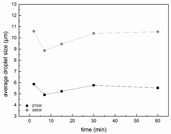 Ultrasonic intensity and treatment times can greatly influence O/W emulsion stability; therefore, appropriate parameters must be found to optimize the shelf life of emulsions. The average droplet size and distributions of 5% coconut oil O/W emulsions stabilized by PGA-XG complexes and prepared by different ultrasonic intensities and treatment times were tested. The droplet size distribution and average particle size of coconut oil O/W emulsions are shown in Figure 6 and Figure 7. The shear rate of ultrasonic power decreased the droplet size of the coconut oil in the O/W emulsion [22]. The mixture of PGA and XG formed a film around the droplet surface, which better maintained the stability of the 5% coconut oil O/W emulsions [23]. The polysaccharides formed a relatively thick hydrophilic coating around the coconut oil droplets and generated a strong steric repulsion that prevented aggregation in the O/W emulsions. As shown in Figure 6, the average particle size of the O/W emulsions prepared by a 270 W intensity ultrasound wave was significantly smaller than those prepared by 390 W. The experimental results showed that the ultrasonic time greatly influenced the average particle size of the emulsions. The O/W emulsion prepared by 270 W for 7 min exhibited the smallest average particle size.