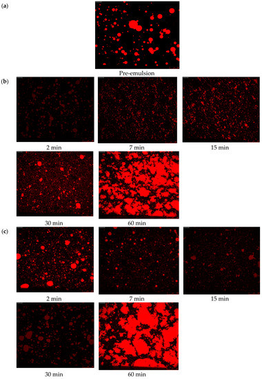 Microstructures of fresh coconut (O/W) emulsions treated by ultrasonic waves and observed via fluorescence microscopy: (a) pretreatment emulsion, (b) O/W emulsions treated by 270 W, and (c) O/W emulsions treated by 390 W.