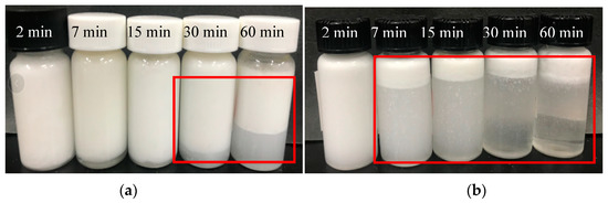 General appearance of 5% coconut oil O/W emulsions prepared by different ultrasonic intensities and treatment times after 30 days of storage at 30 °C: (a) 270 W and (b) 390 W.