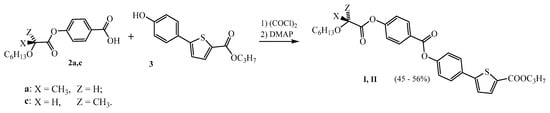 The synthesis of the target liquid crystalline material (Figure 2) started from chiral acids 2a and 2c prepared according to methods (A) and (B), respectively, which provided the best results. The acids were first transformed to appropriate acid chlorides, which were subsequently used for the acylation of hydroxy ester 3, prepared according to a method described in the literature [19], in the presence of DMAP as a base.