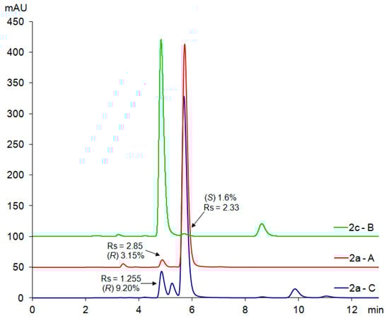 The chiral separation method was based on a previously optimised methodology available in our laboratory for the enantioseparation of chiral photosensitive LCs [11,12,13]. Optimal separation conditions for precursors 2a–d were heptane/propan-2-ol (9/1, v/v). Pure (R)- and (S)-enantiomers were screened individually, and the position of the enantiomeric impurity in the main substance was determined by comparing the retention times (Figure 3).