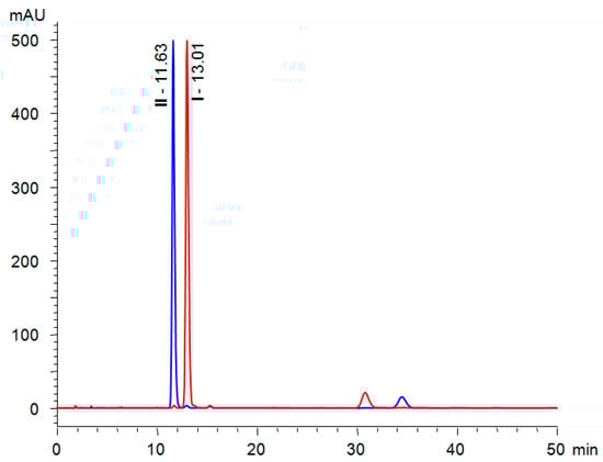 The developed separation method for the precursors was further successfully applied for the chiral separation of full-length liquid crystals (RS = 2.5). Due to the shift in the absorption maximum of the target compound, the detection wavelength was set to 308 nm. To determine contamination of target CLCs with an opposite enantiomer, we prepared corresponding (S)- and (R)-enantiomers (I and II, respectively), and analysed them independently (Figure 4).