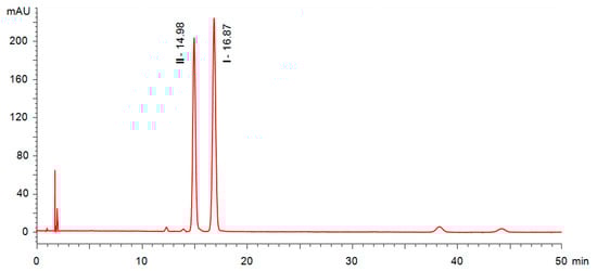 Recently, it has been shown that SFC offers striking selectivity in the enantioseparation of chiral liquid crystals [9,10]. Therefore, we prepared a spiked sample, which enabled us to determine the elution order of enantiomers and match the chiral impurities (observed in HPLC mode) to the corresponding materials. Indeed, the SFC analysis provided better resolution (RS = 3.1), not only for the target materials, but also for chiral impurities present in the materials (Figure 5). The elution order of I and II remained unchanged; material II eluted in the first peak.