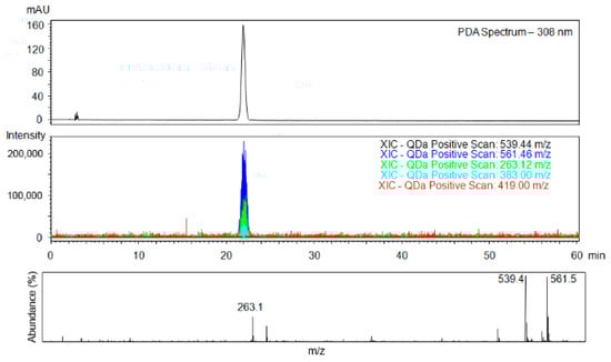 Analysis of purified target material I performed in SFC-MS mode. Upper part shows the UV trace, lower part shows reconstructed chromatograms (XIC) with the mass of the target material 539.4 [M + H]+, 561.5 [M + Na]+, fragments 263.1 [M + H]+, 383.0 [M + H]+, and the main impurity 419.0 [M + H]+ and mass spectrum of the product. Conditions: ChiralArt Amylose-C (250 × 4.6 mm, i.d., 5 µm) column, mobile phase scCO2/IPA (70/30), flow rate of 1 mL/min, sample concentration 0.5 mg/mL, injection volume 5 µL, temperature 30 °C, backpressure 2000 psi, ESI+.