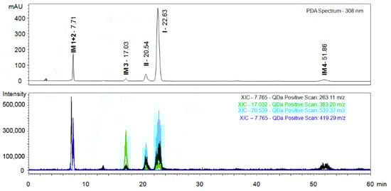 SFC-MS analysis of major impurities (IM) of the target compound I. Upper part shows the UV trace, lower part reconstructed chromatograms with masses of the target materials and impurities originating from the synthesis. Conditions: ChiralArt Amylose-C (250 × 4.6 mm, i.d., 5 µm) column, mobile phase scCO2/IPA (70/30), flow rate of 1 mL/min, sample concentration 1.0 mg/mL, injection volume 10 µL, temperature 30 °C, backpressure 2000 psi, ESI+.