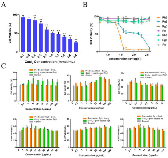 2.1. Ginsenosides Attenuated CoCl2-Induced Cytotoxicity of PC12 Cells