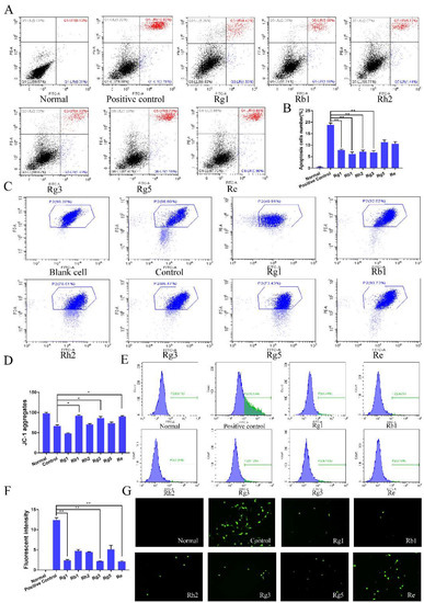 2.2. Ginsenosides Reduced Neuronal Apoptosis, ROS Level and Increased Mitochondrial Membrane Potential of PC12 Cells