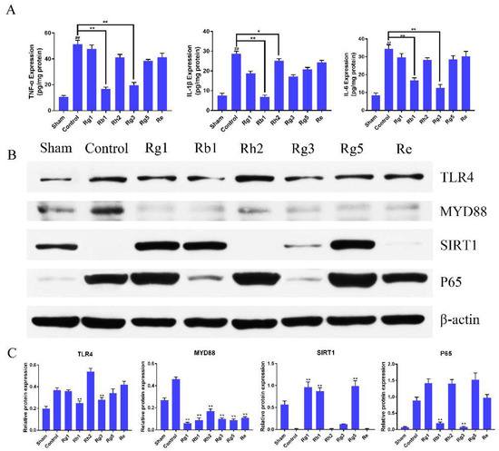 2.5. Ginsenosides Inhibited TLR4/MyD88 and SIRT1 Activation Signaling Pathway in Penumbra Tissue