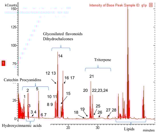 Representative chromatogram of apple peels; the principal classes of phytoconstituents are highlighted; numbers of the identified metabolites are those reported in Table 1.