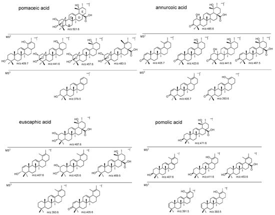 Tentative structures proposed for the main fragment ions of pomaceic, annurcoic, euscaphic and pomolic acids in the MSn study.