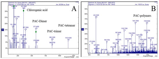 Cumulative spectra obtained from the chromatogram regions 3–10 min (A) and 18–22 min (B) showing the relative intensity of m/z species corresponding to different (proanthocyanidin) PAC species.