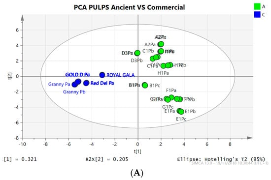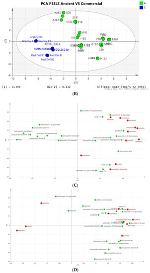 The datasets obtained from the LC-ESI and LC-APCI methods, used for the analysis of polyphenols and triterpene acid respectively, were merged together and targeted multivariate data analysis was performed considering triterpene and phenolic derivatives. Figure 4 summarized the results obtained for four commercial and nine ancient apple varieties. PCA clearly shows differences (R2X 0.321, Q2X 0.2285 for pulps and R2X 0.399, Q2X 0.349 for peels), between the two apple groups indicating that the chemical profiles of peels and pulps of the ancient and commercial apples are different.