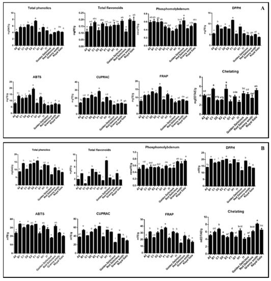 To provide a full picture for antioxidant properties of the apple samples, different in vitro assays (phosphomolybdenum, metal chelating, reducing power (CUPRAC and FRAP) and radical quenching (DPPH and ABTS)) were performed, data are reported in Figure S5 and Tables S1–S3 in Supplementary Materials. In phosphomolybdenum assay, the samples exhibited similar activities and the best activity was observed in peels of ‘Royal Gala’ (0.74 mmolTE/g), followed by peels of ‘Red delicious’ (0.72 mmolTE/g) and ‘Granny Smith’ (0.66 mmolTE/g) (Figure 5). In previous papers [35,36,37], the assay was used to assess total antioxidant capacity of extracts. In reducing power assays, F1B exhibited the strongest ability (62.72 mgTE/g for CUPRAC and 37.66 mgTE/g for FRAP), followed by E2B, H1B and B1B (Figure 5). These results seem to be linked to the fact that these extracts had a higher concentration of total phenolics and flavonoids. This approach was also confirmed by several researchers, who reported a linear correlation between total phenolic and reducing abilities. [38,39]. Regarding radical quenching assays (ABTS and DPPH), B1B and F1B had significant higher activity than other samples (Figure 5). Similar to total bioactive compounds, peel samples were more active on these radicals than pulp samples. In this sense, observed activity could be attributed to levels of total bioactive compounds and this is accordance with earlier reports [40,41].