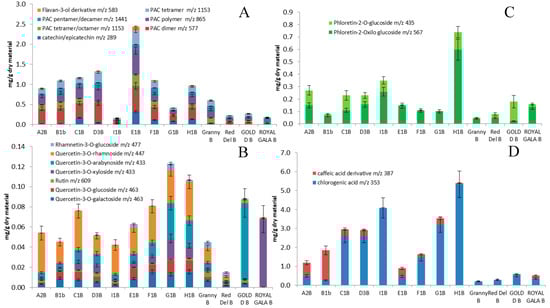Catechin, PAC and flavonoid contents of peels of ancient and commercial samples were in the same concentration range both from a qualitative and quantitative point of view. Procyanidin dimer (m/z 577) represented the 18–40% of total PAC content in ancient varieties (19–26% in commercial ones). Average values of PAC derivatives in ancient apple peels were higher than those of commercial apples, being 1.51 and 1.09 mg g−1, respectively (Figure 7). Average values of caffeic acid derivatives were 1.90 and 0.18 mg/g for ancient and commercial samples, respectively. However, a high variation was observed in the various ancient varieties, with concentrations ranging from 0.19 (E1B) to 4.97 mg/g (I1B). The average amount of flavonoids was similar in the two apple groups being 3.86 and 2.16 mg/g for ancient and commercial samples, respectively. Quercetin-3-O-galactoside was the most abundant flavonoid derivative in the four commercial samples and in five out of nine ancient apple varieties. Other abundant flavonoids in ancient apples were rutin (C1B), quercetin-3-O-arabinoside (D3B) and quercetin-3-O-rhamnoside (A2B and F1B).