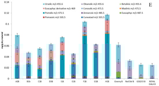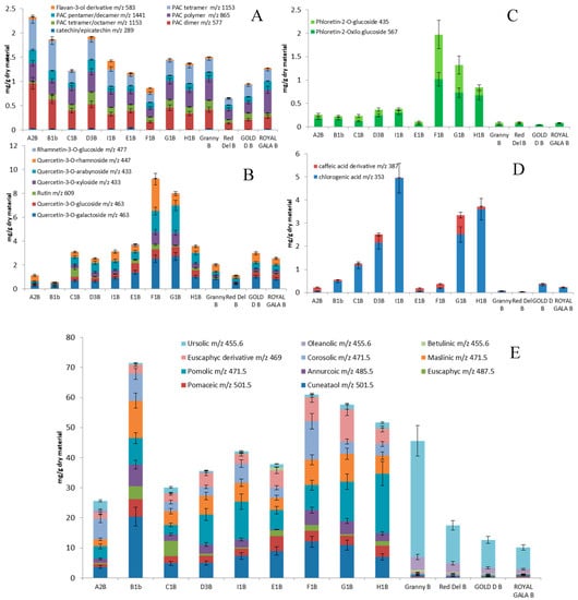 Contents, mg/g on dry material, of flavan-3-ols and procyanidins (A), flavonoids (B), chalcones (C), hydroxycinnamic acids (D) and triterpene acids (E) in apple peels. In the X axis: Granny: ‘Granny Smith’, Red Del: ‘Red Delicious’, Gold D: ‘Gold Delicious’.