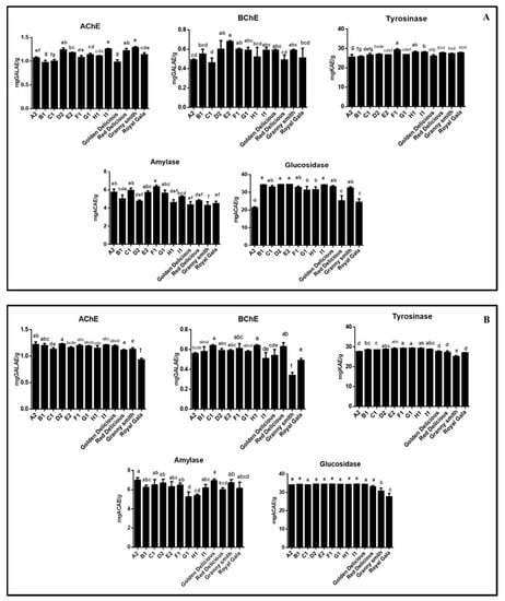 The enzyme inhibitory capacity of the apple samples was investigated towards cholinesterases, tyrosinase, amylase and glucosidase due to the very well-known importance of such enzymes in some pathological diseases (Figure 8). The pulps and peels had similar AChE and BChE inhibitory effects. The strongest abilities was observed in the pulp of ‘Granny smith’ (1.29 mgGALAE/g for AChE) and E2P (0.68 mgGALAE/g for BChE), respectively. Additionally, G1B (29.35 mgKAE/g) and F1B (29.27 mgKAE/g) showed very close tyrosinase inhibitory effects. A similar case was found for A2B (6.99 mgACAE/g) and the pulp of ‘Golden delicious’ (6.94 mgACAE/g) against amylase. The most potent glucosidase inhibitory effects were found in E2P, D2B and I1B and their results were similar. Generally, the peel samples had higher inhibitory effects when compared to pulp samples against the tested enzymes. From this point, the presence of proanthocyanidins, triterpenoids or hydroxycinnamic acids might be attributed to observed enzyme inhibitory effects. These compounds have been already reported as anti-Alzheimer and anti-diabetic agents [44,45,46,47,48].
